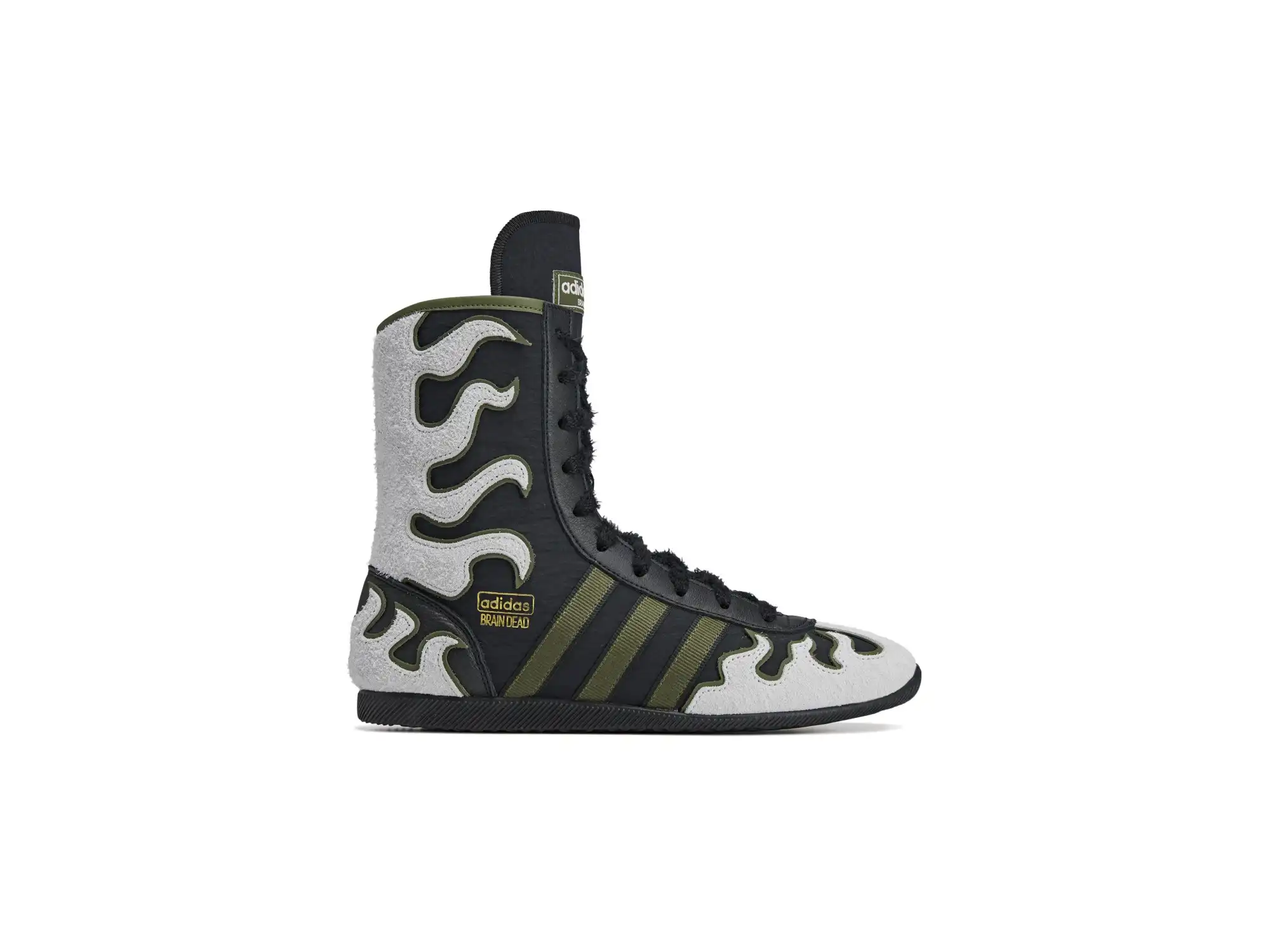 For the high-cut version, the Japan Hi Brain Dead channels the look of wrestling boots. Featuring the same flame-inspired overlays, this version stands out in black with off-white details and pine green accents. It blends wrestling nostalgia with Brain Dead’s subversive design language.