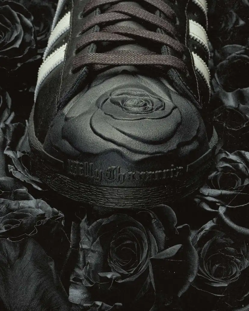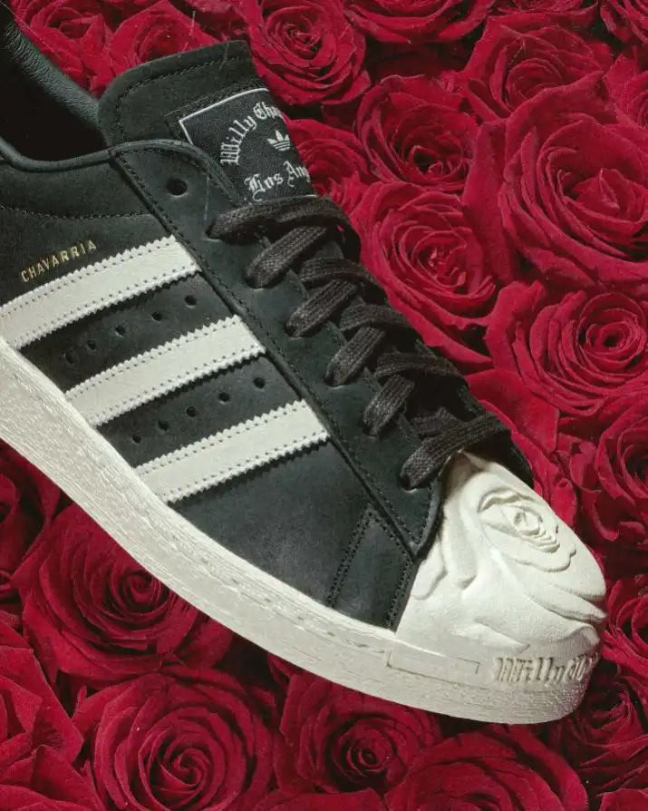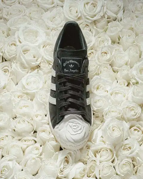 At the core of the collection sits the reimagined adidas Superstar, transformed through Chavarria’s unmistakable lens. The standout feature is the molded rose shell toe, a bold reinterpretation of one of adidas’ most recognizable design elements. It shifts the silhouette from familiar to expressive, adding a layer of symbolism that aligns with the collection’s theme of strength through vulnerability.