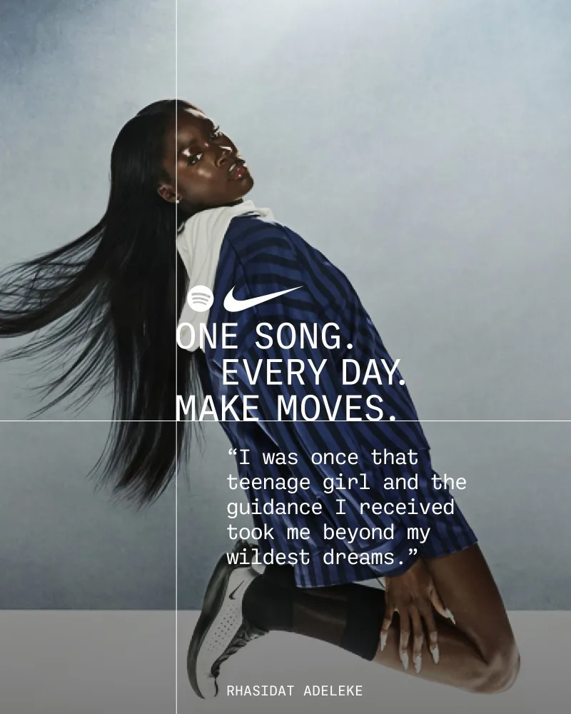 Make Moves is the latest example of Nike’s commitment to shaping the future of sport. The brand publishes guides that break down barriers and partners on free coaching tools. Spotify, with its global reach, amplifies this vision by making music the universal connector.
